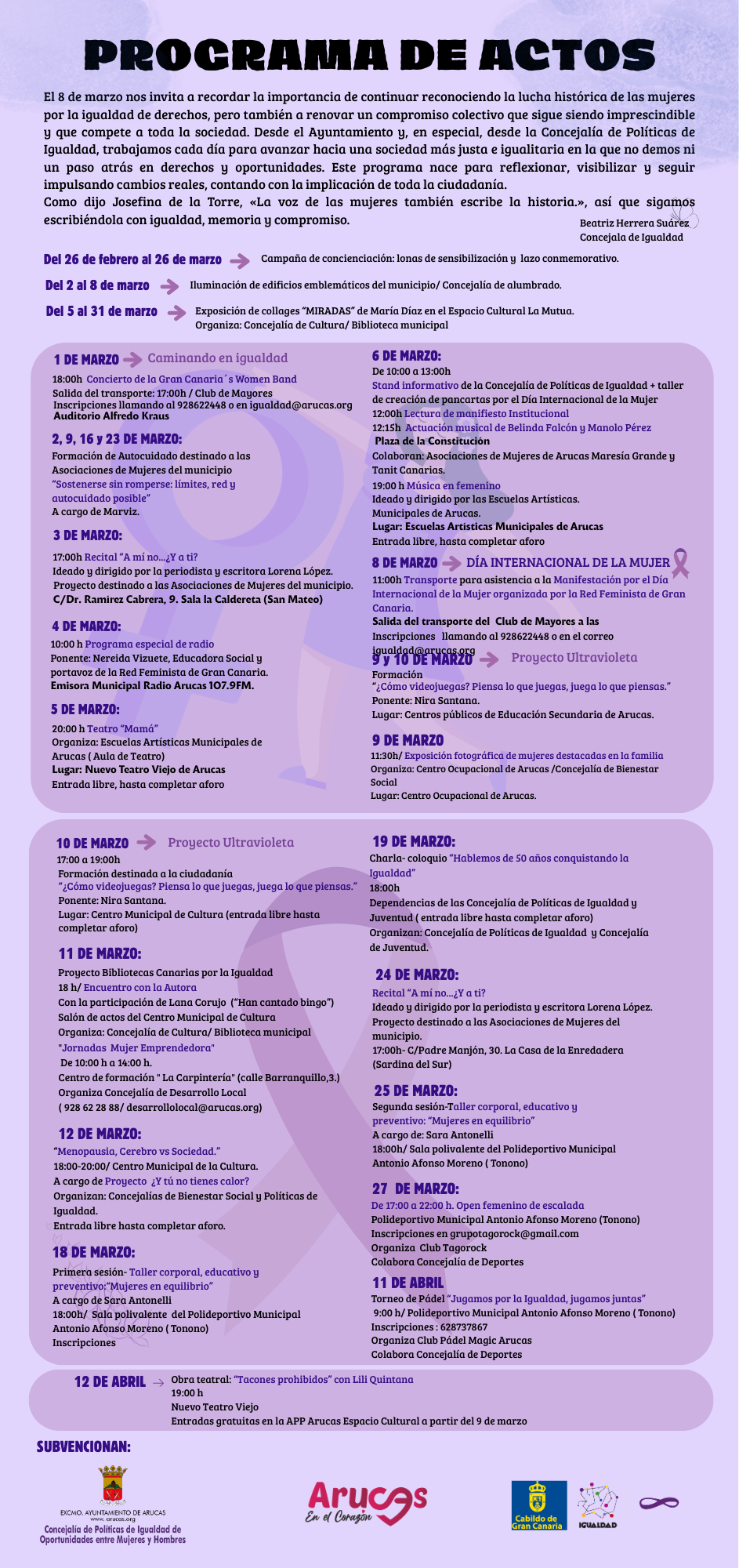 El programa, orientado al bienestar emocional, ofrece dos talleres gratuitos, los miércoles 18 y 25 de marzo, en el Pabellón Municipal Olímpico José Juan Navarro Batista. Las plazas son limitadas y se requiere inscripción previa en el 928 62 24 48, presencialmente en la Pza. De Los Derechos Humanos 3, o en igualdad@arucas.org.