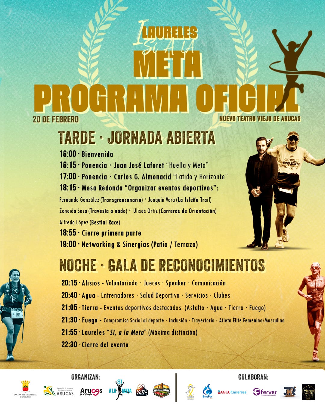 Los Premios Laureles “Sí a la meta” reconocen los valores, la constancia, el sacrificio y la deportividad tanto de deportistas como de aquellos que hacen posible una línea de meta. El programa de esta primera edición contempla, a partir de las 16:00 horas, la celebración de dos ponencias, la primera del Cronista de Gran Canaria y Atleta Don Juan José Laforet, y la segunda de Carlos G. Almonacid, uno de los coach motivacionales más reconocidos a nivel nacional e internacional.